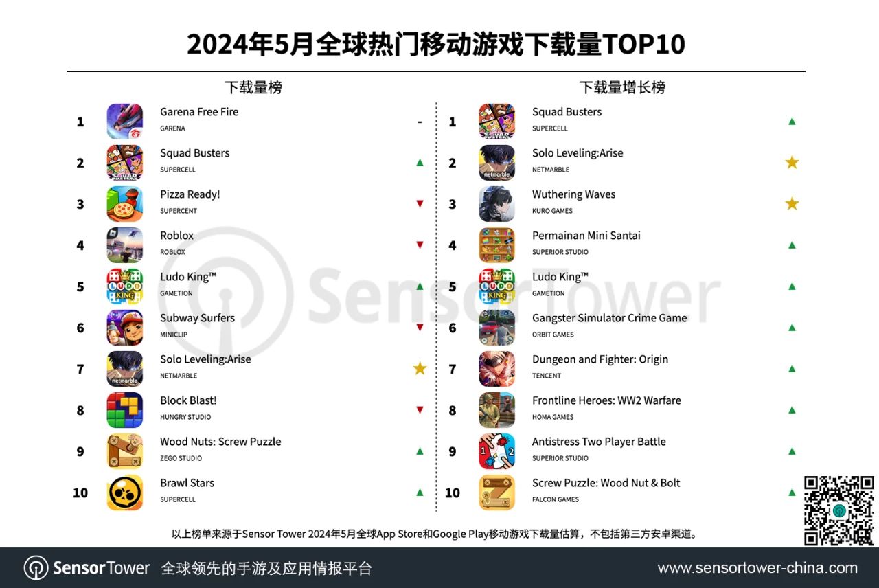 5月,三款新手游在下载增加榜上占了一席之地:Netmarble《Solo Leveling:Arise》、Kuro Games《Wuthering Waves》和由腾讯发行的《地下城与勇士:来源》。